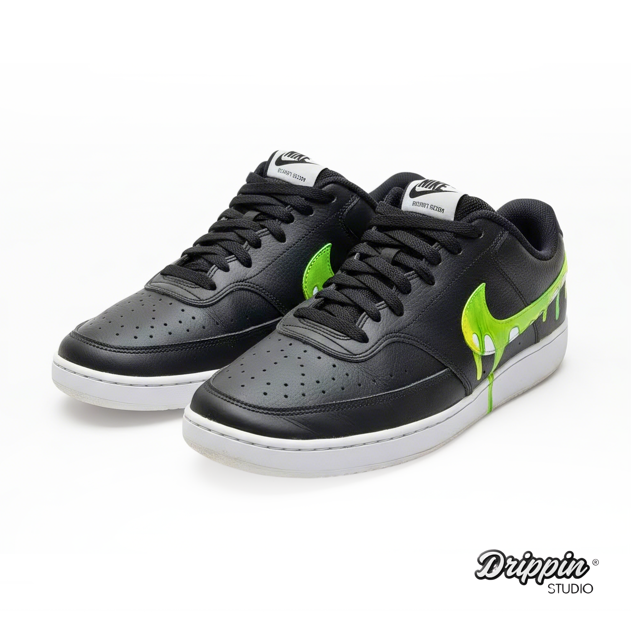 The neon drip breaks through the black structure, creating contrast, tension, and motion in a single gesture.