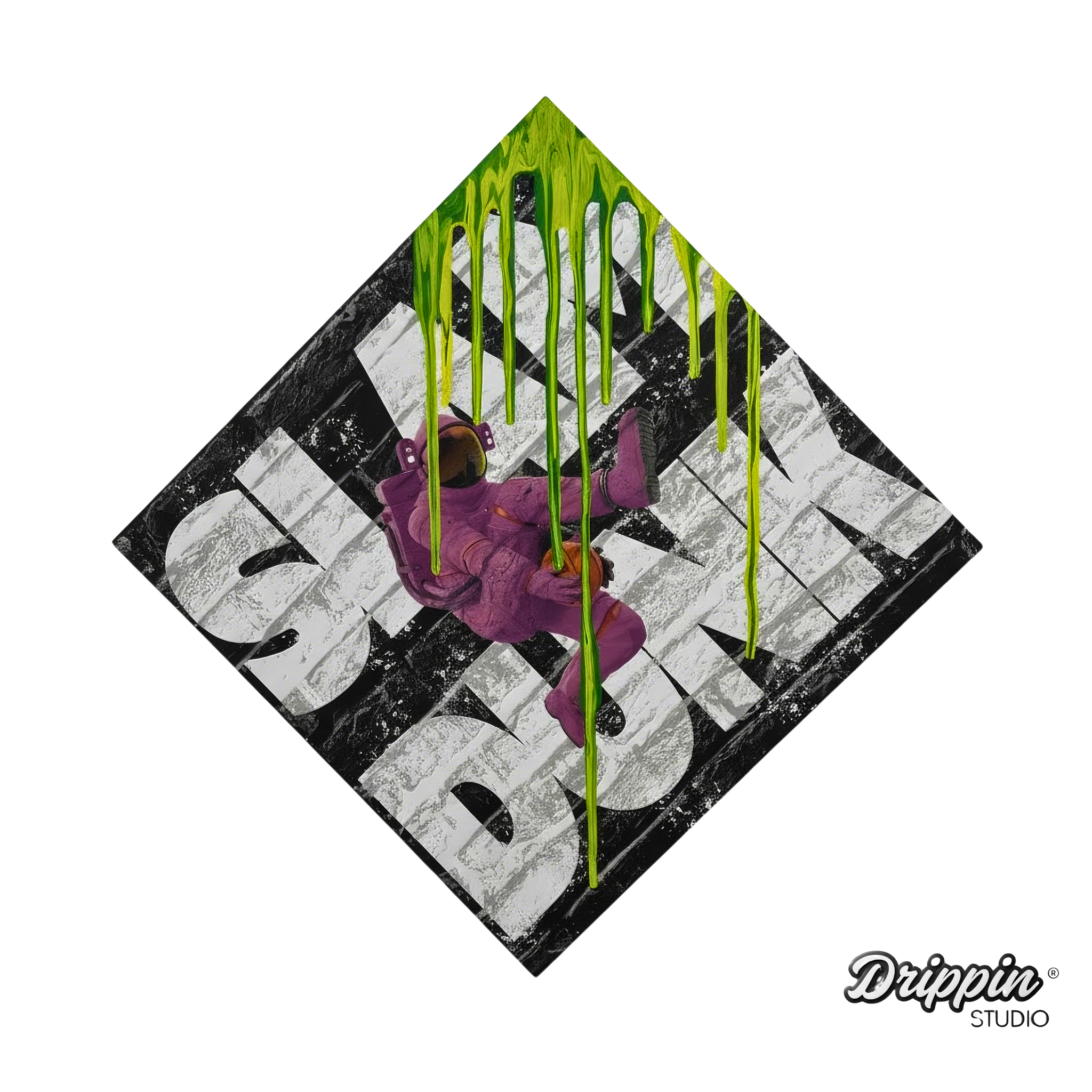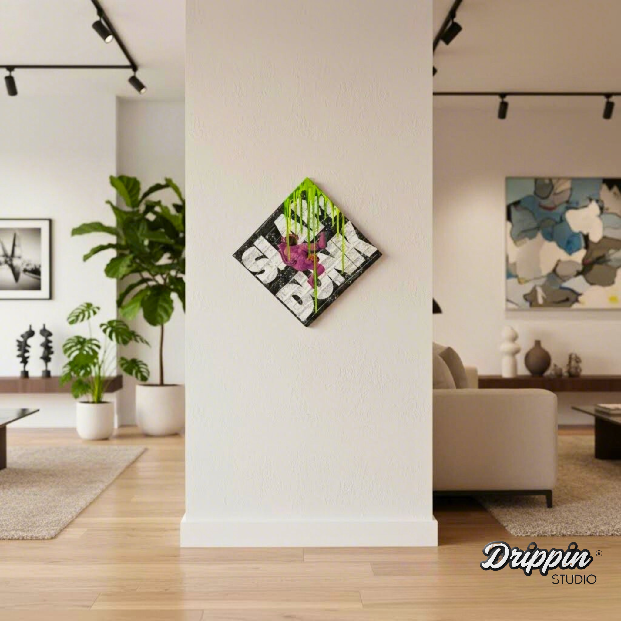 DRIP DROP plays with contrast—structured typography and form disrupted by a bold neon green flow. The drip cuts through the piece with intention, adding movement to an otherwise controlled layout.