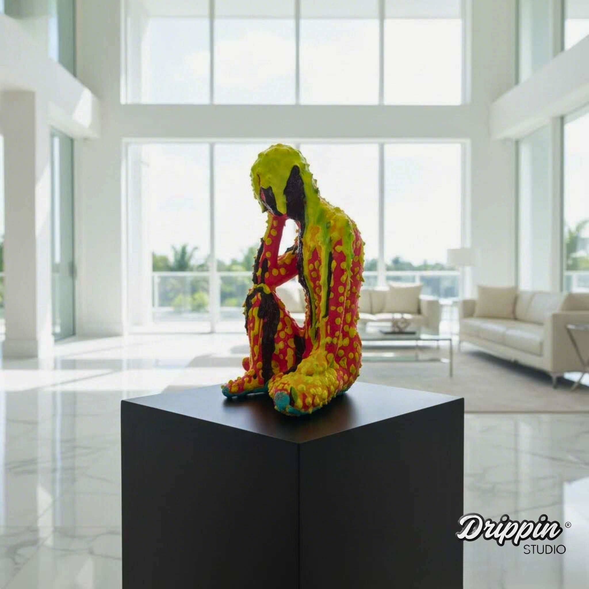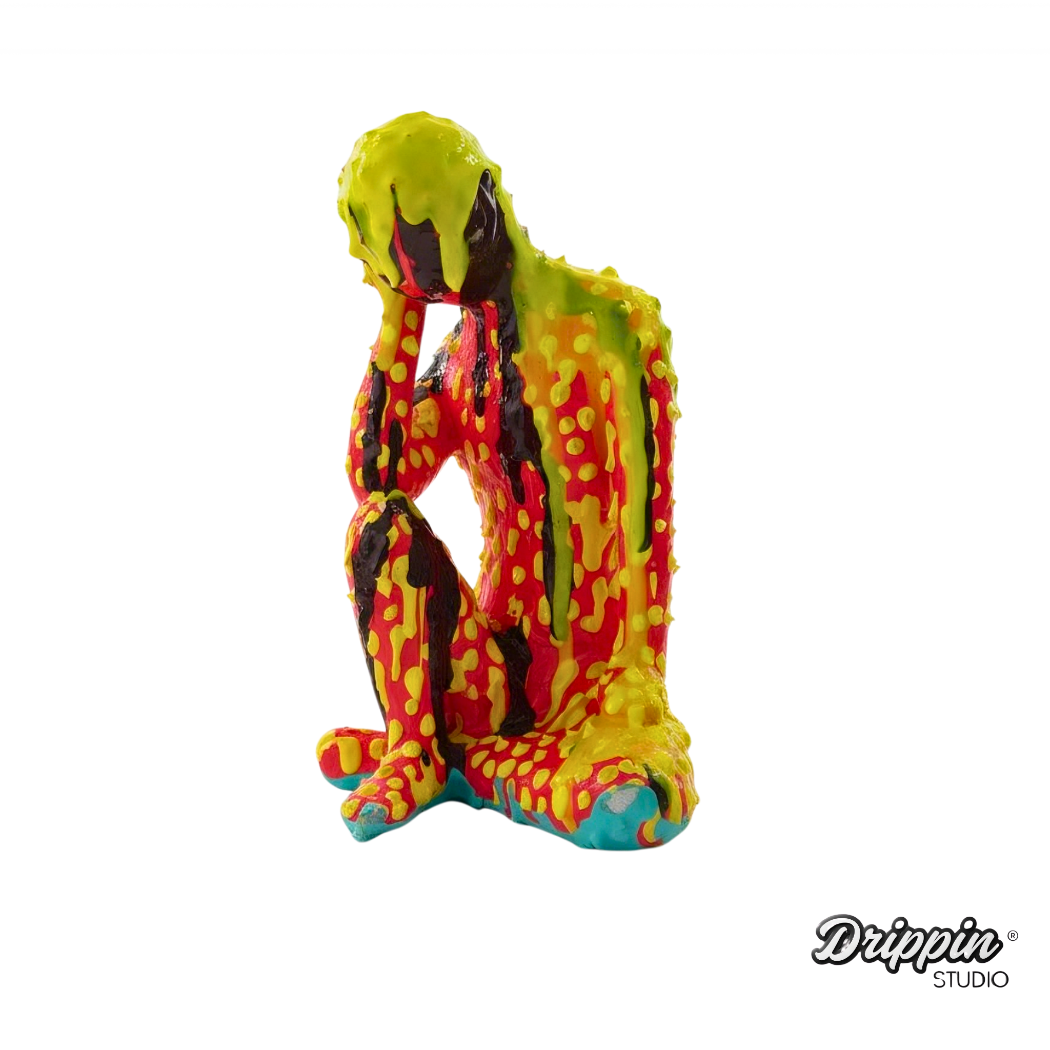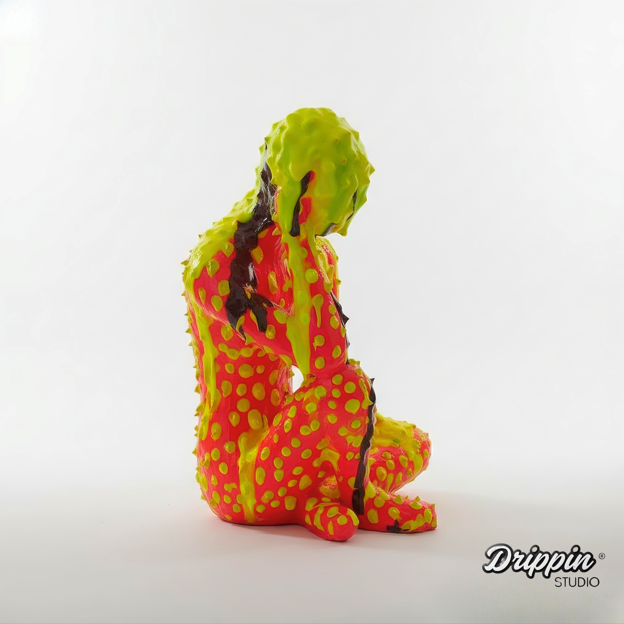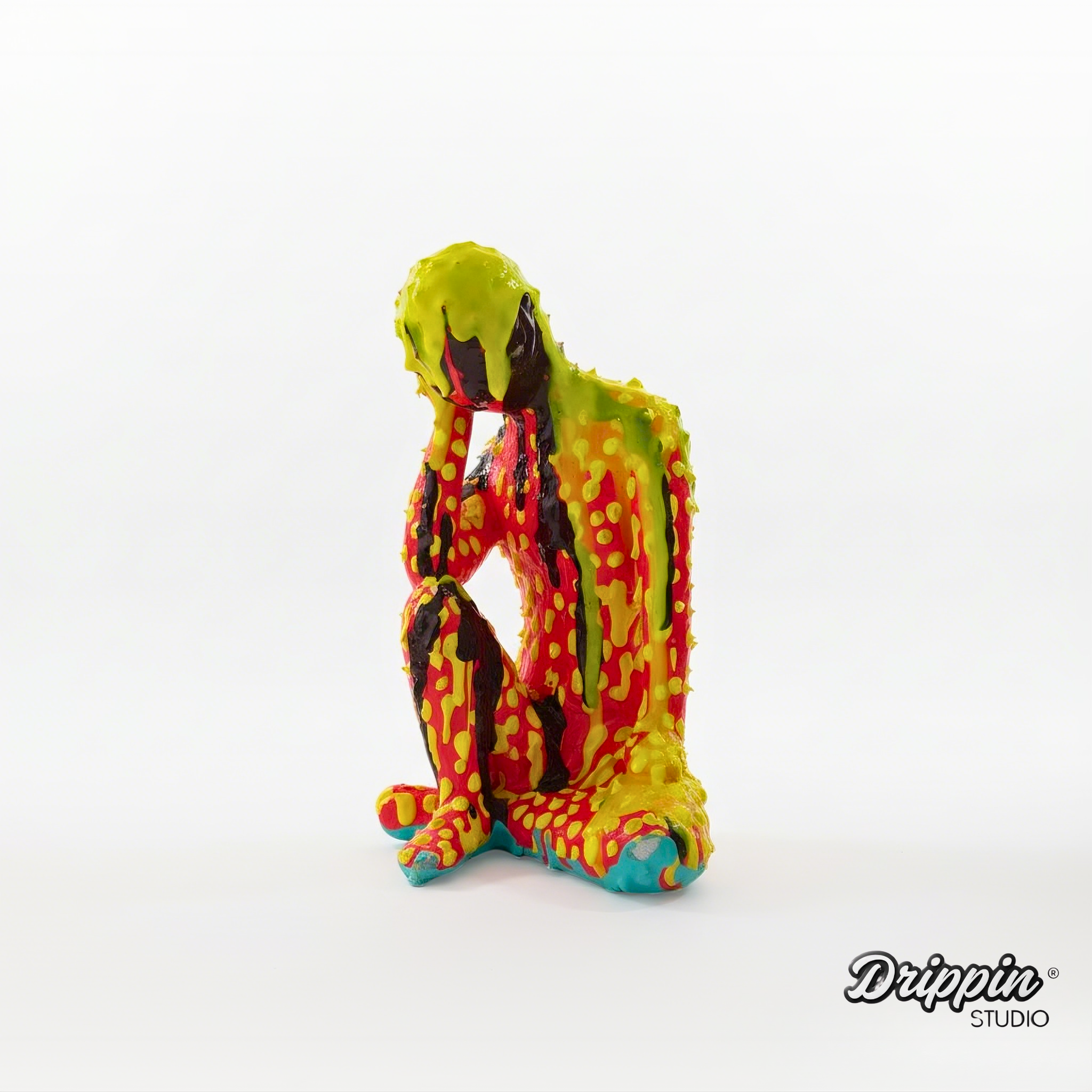 A seated figure, covered in thick, dripping layers of color. The paint melts over the body, blurring its form, pulling it downward.